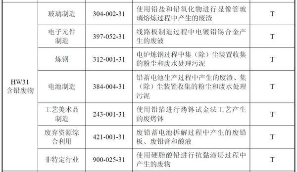 根據(jù)《國家危險廢物名錄》(2016版),HW31含鉛廢物來源于玻璃制造、電子元件制造、煉鋼、電池制造、工藝美術(shù)品制造、廢棄資源綜合利用以及某些非特定行業(yè),主要包括使用鉛鹽和鉛氧化物進行顯像管玻璃熔煉過程中產(chǎn)生的廢渣、線路板制造過程中電鍍鉛錫合金產(chǎn)生的廢液、電爐煉鋼過程中集(除)塵裝置收集的粉塵和廢水處理污泥、鉛蓄電池生產(chǎn)過程中產(chǎn)生的廢渣、集(除)塵裝置收集的粉塵和廢水處理污泥等。
