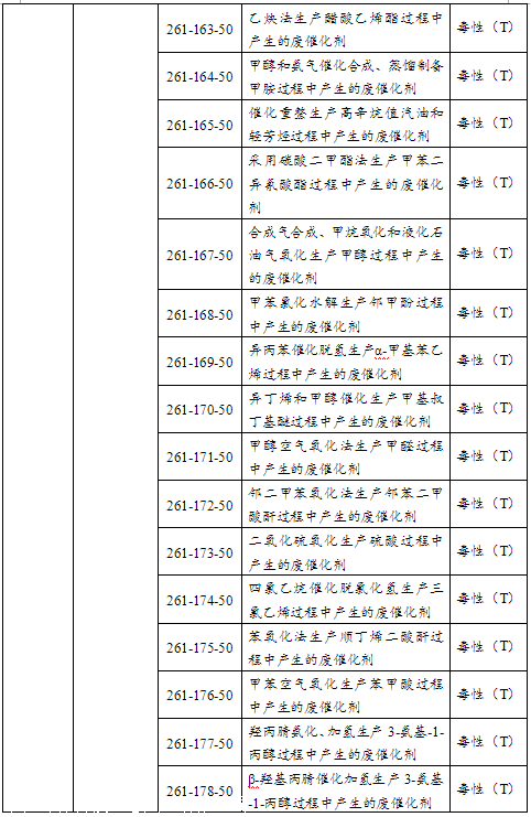 根據(jù)《國家危險廢物名錄》(2016版),HW50廢催化劑來源于精煉石油產(chǎn)品制造、基礎(chǔ)化學原料制造、農(nóng)藥制造、化學藥品原料藥制造、獸用藥品制造、生物藥品制造、環(huán)境治理等行業(yè),主要包括石油產(chǎn)品催化裂化過程中產(chǎn)生的廢催化劑;樹脂、乳膠、增塑劑、膠水/膠合劑生產(chǎn)過程中合成、酯化、縮合等工序產(chǎn)生的廢催化劑;有機溶劑生產(chǎn)過程中產(chǎn)生的廢催化劑;化學原料制備過程中產(chǎn)生的廢催化劑以及廢汽車尾氣凈化催化劑等。